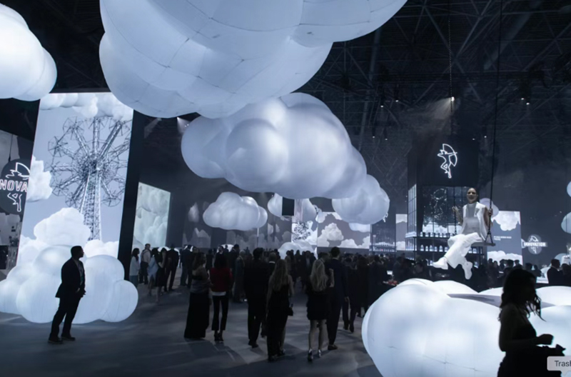 我們獨特的設(shè)計理念之一,便是通過材料講述故事——這通常意味著選擇非常規(guī)的材料來呈現(xiàn)引人入勝的故事。例如,我們曾為羅賓漢慈善活動創(chuàng)作過一個裝置作品,該作品由1萬張地鐵卡組成,這些地鐵卡后來被捐贈出去。除了令人印象深刻之外,它還有效地講述了羅賓漢基金會在疫情后如何幫助紐約市民重返工作崗位的故事。無論是鮮花,還是地鐵卡、色卡、運動器材等日常用品,每一個設(shè)計元素都經(jīng)過精心挑選,旨在強化我們想要傳達的故事。如果它不能增強敘事效果,就不會被采用。